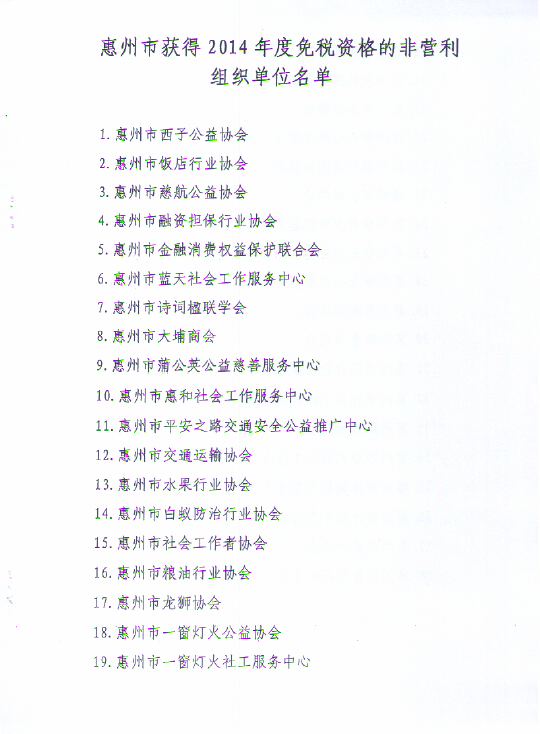 關于公布惠州市獲得2014年度兌稅資格的非營利組織單位名單的通知