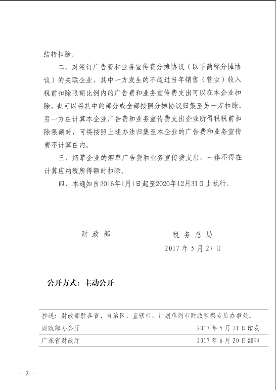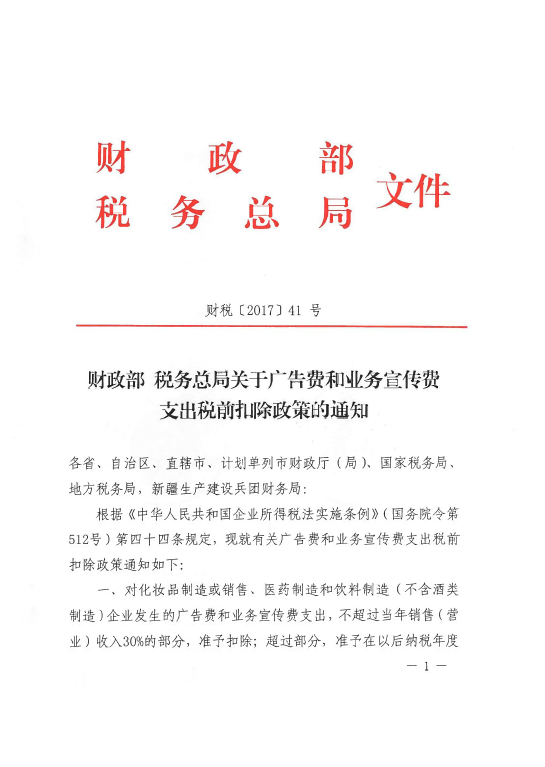 財政部 稅務(wù)總局 關(guān)于廣告費和業(yè)務(wù)宣傳費支出稅前扣除政策的通知