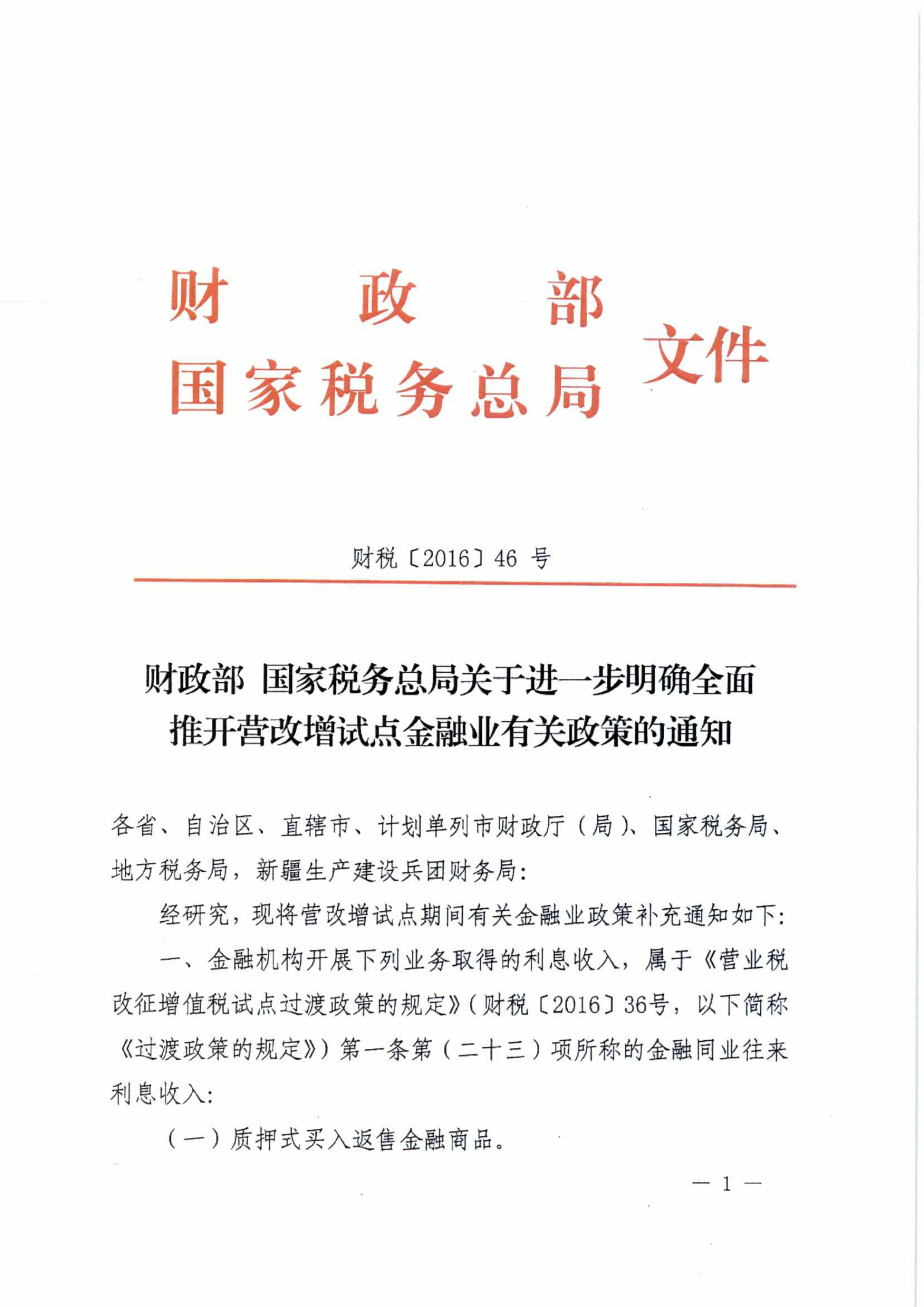財(cái)政部 國(guó)家稅務(wù)總局關(guān)于進(jìn)一步明確全面推開(kāi)營(yíng)改增試點(diǎn)金融業(yè)有關(guān)政策的通知