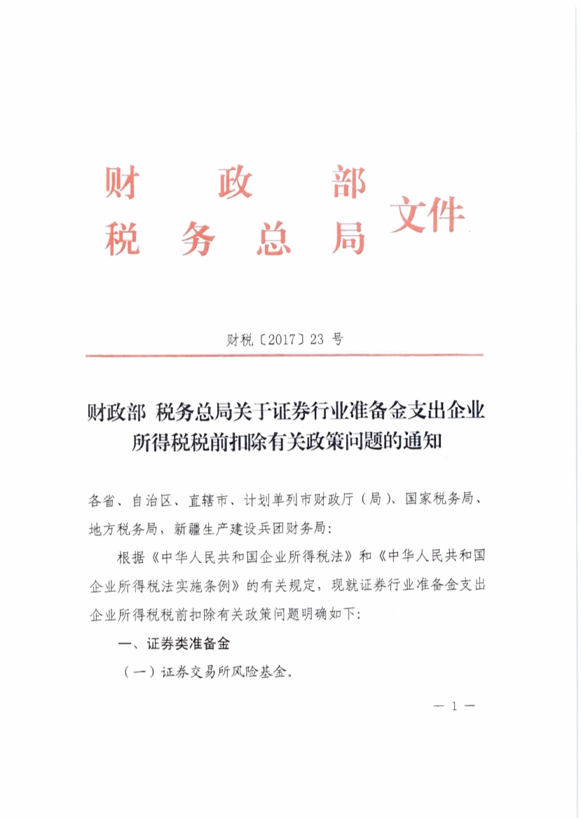 財政部 稅務總局關于證券行業(yè)準備金支出企業(yè)所得稅稅前扣除有關政策問題的通知