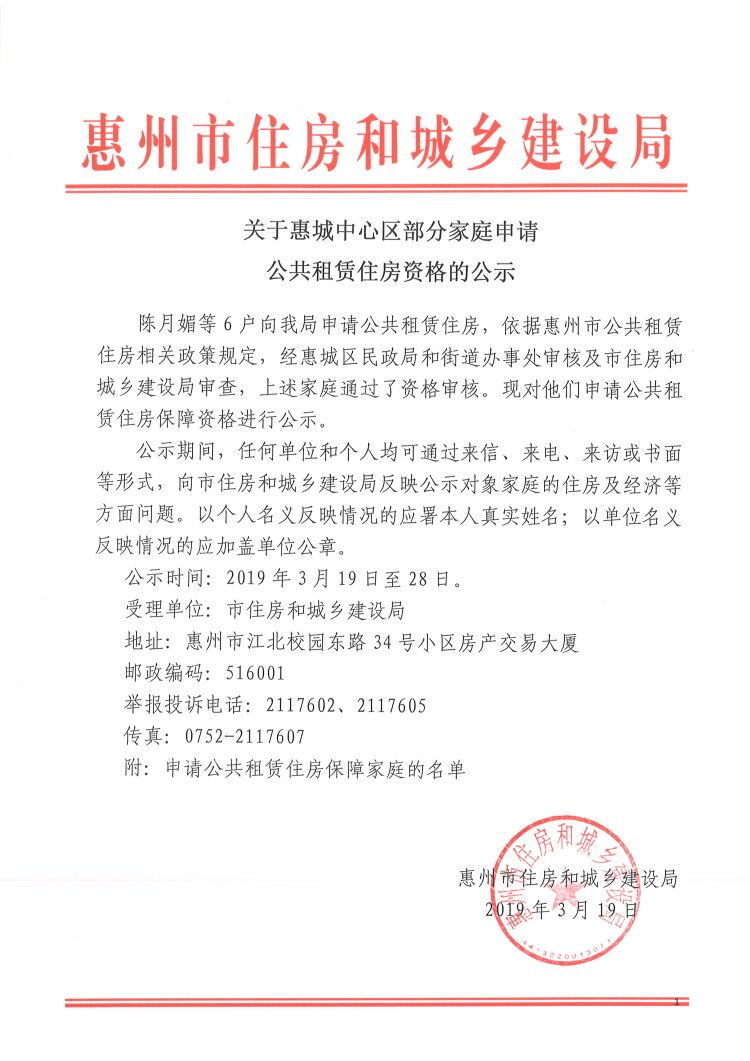 關于惠城中心區部分家庭申請公共租賃住房資格的公示