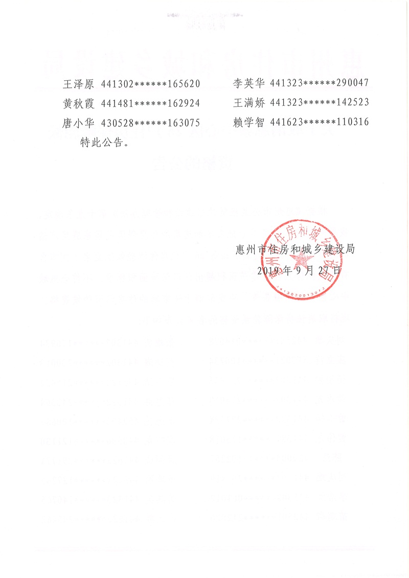 關(guān)于取消惠城中心區(qū)26戶住房保障輪候資格的公告