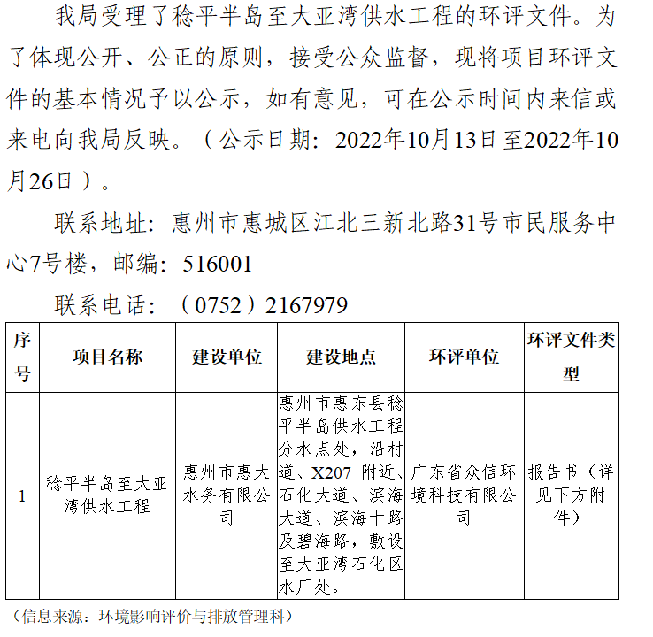 建設項目受理信息公示(稔平半島至大亞灣供水工程)