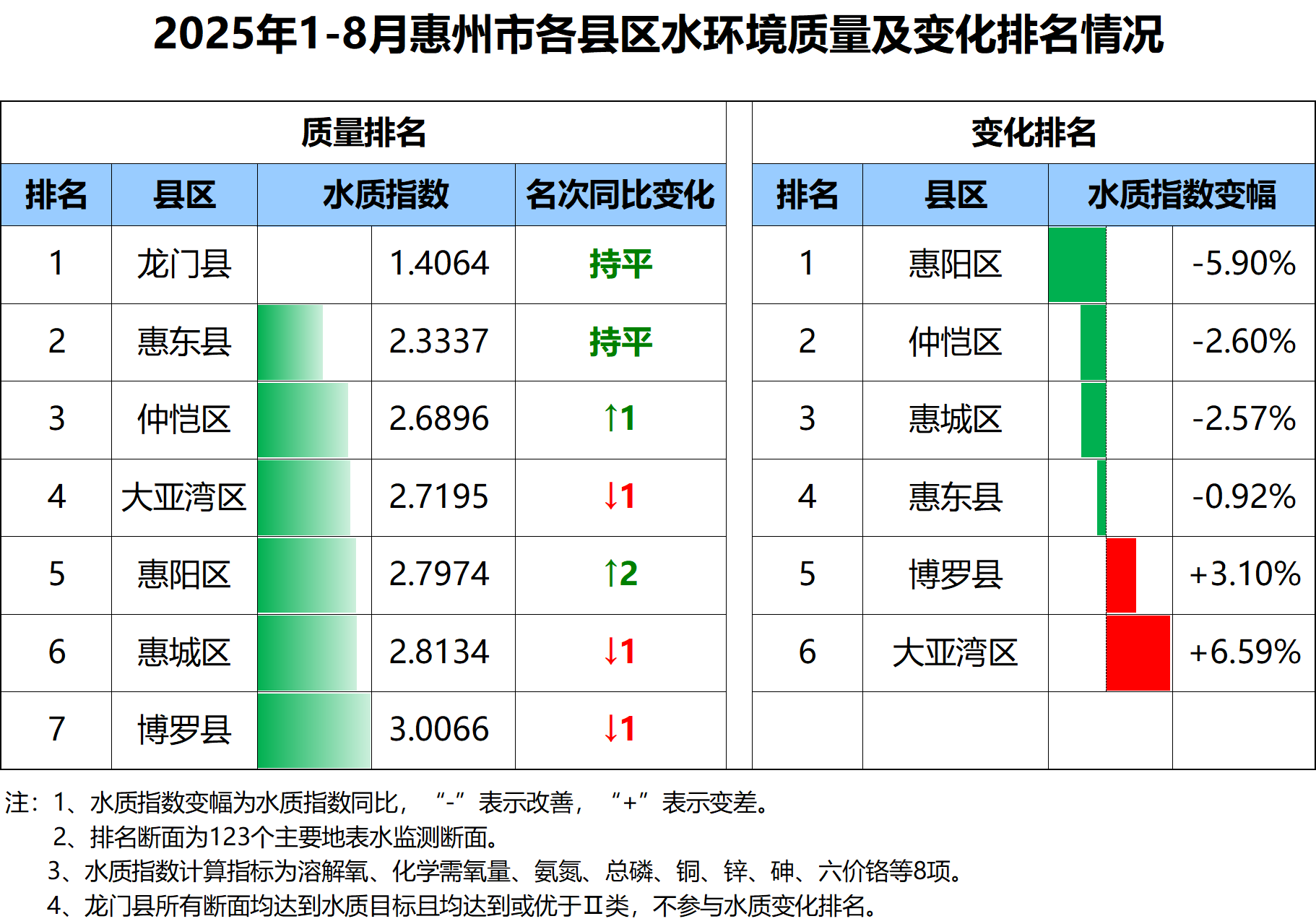 縣區排名:2025年1-8月,根據水質指數排名,水環境質量由好到差依次排名為龍門縣、惠東縣、仲愷區、大亞灣區、惠陽區、惠城區、博羅縣。與2024年同期相比,惠陽區、仲愷區、惠城區、惠東縣等4個縣區水環境質量有所改善,大亞灣區和博羅縣水環境質量有所下降。
