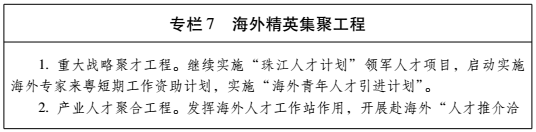(四)優化人才公共服務機制。完善人才引進和服務政策,建立高層次人才、高技能人才引進“綠色通道”。促進粵港澳地區人才自由流動,鼓勵引進港澳創新人才和創新資源,建設粵港澳創業創新合作示范園區。大力引進海外高層次人才,支持高層次留學人員攜尖端技術、高端項目來粵創業。制定外國人才來粵工作服務與管理暫行辦法。完善外國人才在粵工作信用和監管體系。(省人力資源社會保障廳、公安廳、外辦、港澳辦負責)