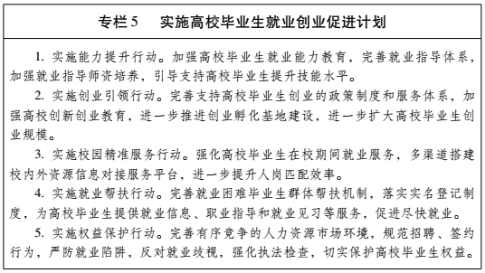 (一)實施高校畢業生就業創業促進計劃。落實能力提升、創業引領、校園精準服務、就業幫扶、權益保護五大行動。引導大中專畢業生轉變擇業觀念和提升就業創業能力,探索放寬高校學生修業年限,允許在讀大學生(含研究生)保留學籍,休學從事創業活動,鼓勵高校畢業生到基層就業。統籌實施大學生村官、高校畢業生到農村從教上崗退費、“三支一扶”計劃、志愿服務西部計劃和農技特崗計劃等服務基層專門項目。繼續做好粵東西北地區鄉鎮事業單位專項公開招聘工作,積極推進政府購買基層公共管理和社會服務崗位吸納高校畢業生就業工作。建立健全高校畢業生求職意愿信息數據庫、離校未就業高校畢業生信息數據庫,加強就業市場供需銜接和精準幫扶,對就業困難和長期失業的畢業生提供“一對一”援助服務。(省人力資源社會保障廳、教育廳,團省委負責)
