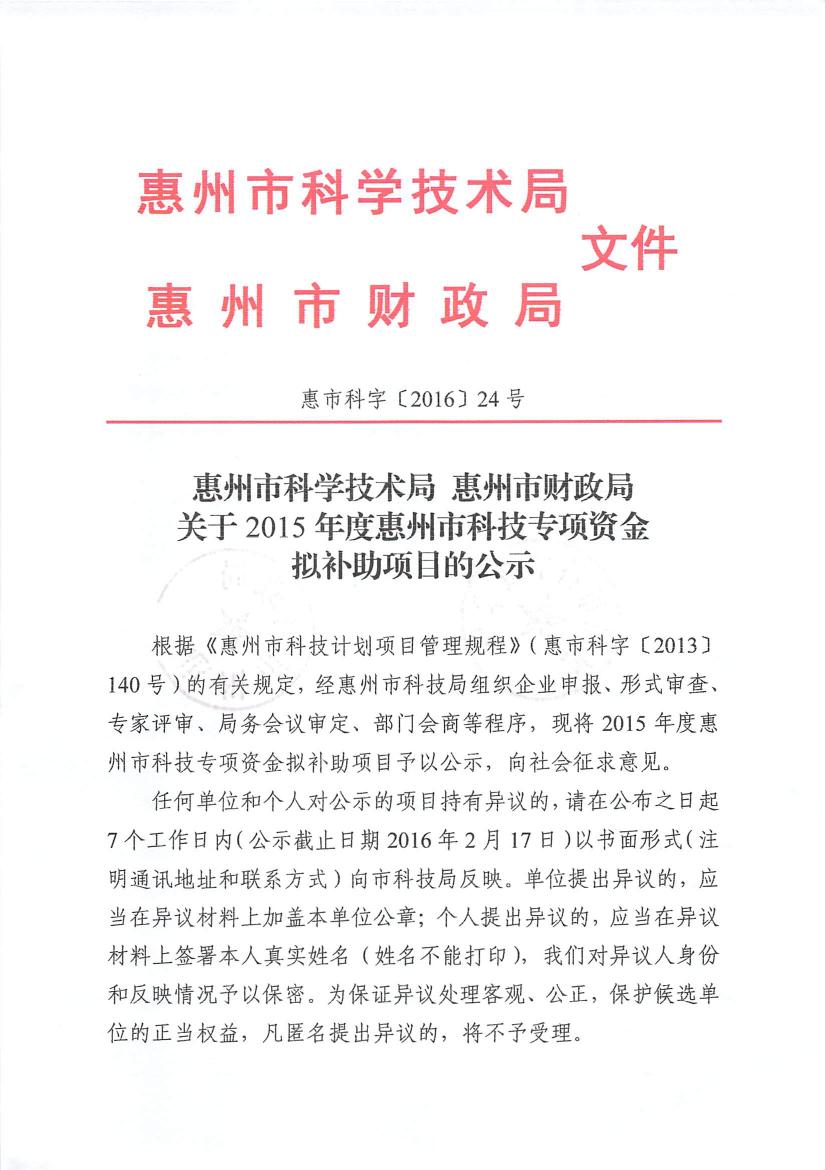 惠州市科學技術局 惠州市財政局關于2015年度惠州市科技專項資金擬補助項目的公示