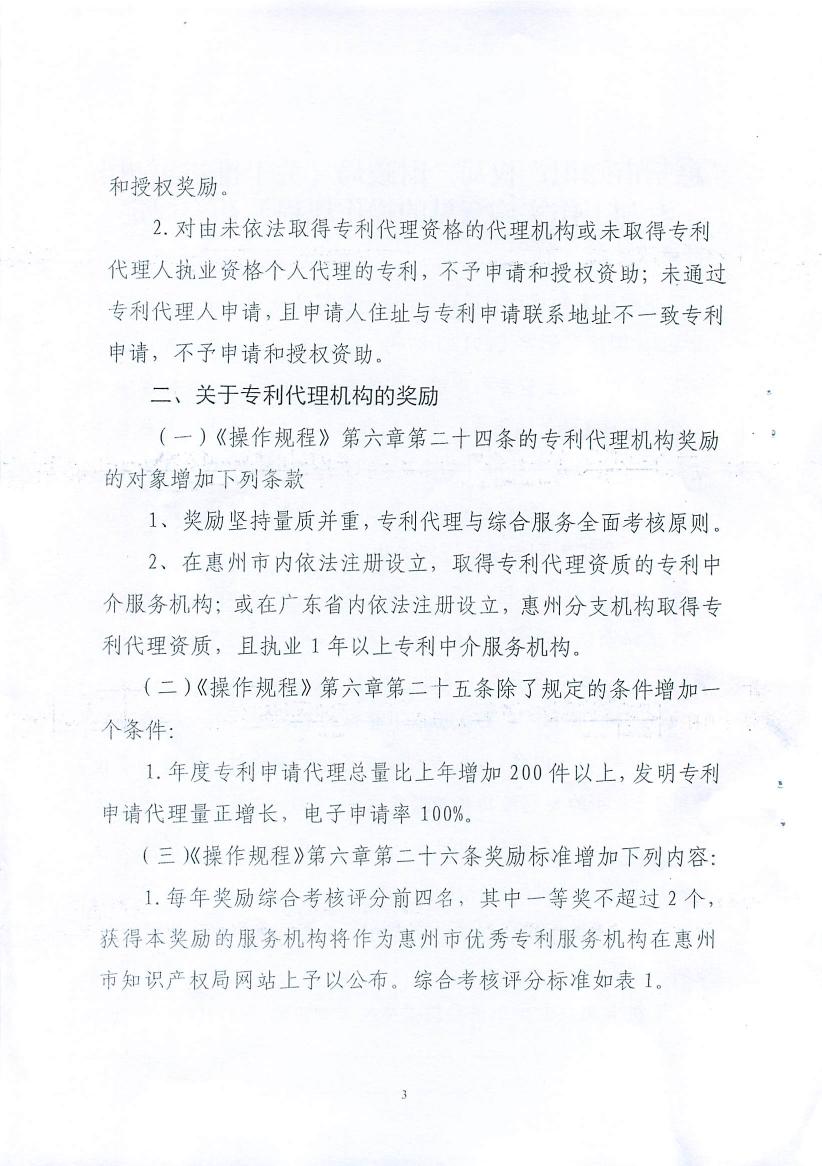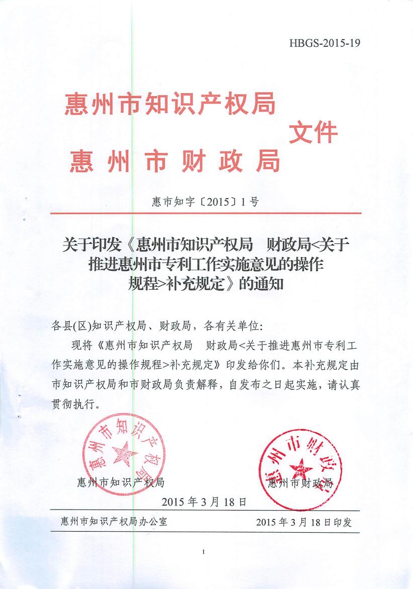 關于印發《惠州市知識產權局 財政局關于推進惠州市專利工作實施意見的操作規程補充規定》的通知