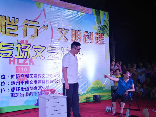 6月26日-7月1日為做好2017年全國文明城市復查工作,展示高新區文明城市創建,共建共享的成果,以文藝演出的宣傳方式,進一步把創建工作引向深入,讓創建全國文明城市活動深入人心,由仲愷區宣教文衛辦主辦的“歡樂仲愷行”文明創建宣傳專場文藝演出走進惠環街道惠新斜下中星社區,以及陳江街道甲子曙光社區專場演出以歌曲、小品、三句半、情景劇以及有獎問答等形式,大力宣傳我區文明城市創建工作。同時也為惠州高水平奪取全國文明城市“四年冠”貢獻一份力。
