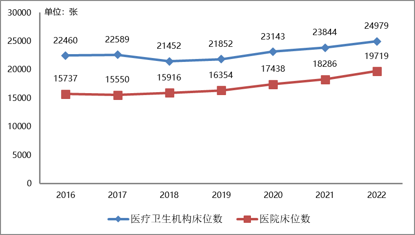 2016-2022年全市醫(yī)療機(jī)構(gòu)床位數(shù)