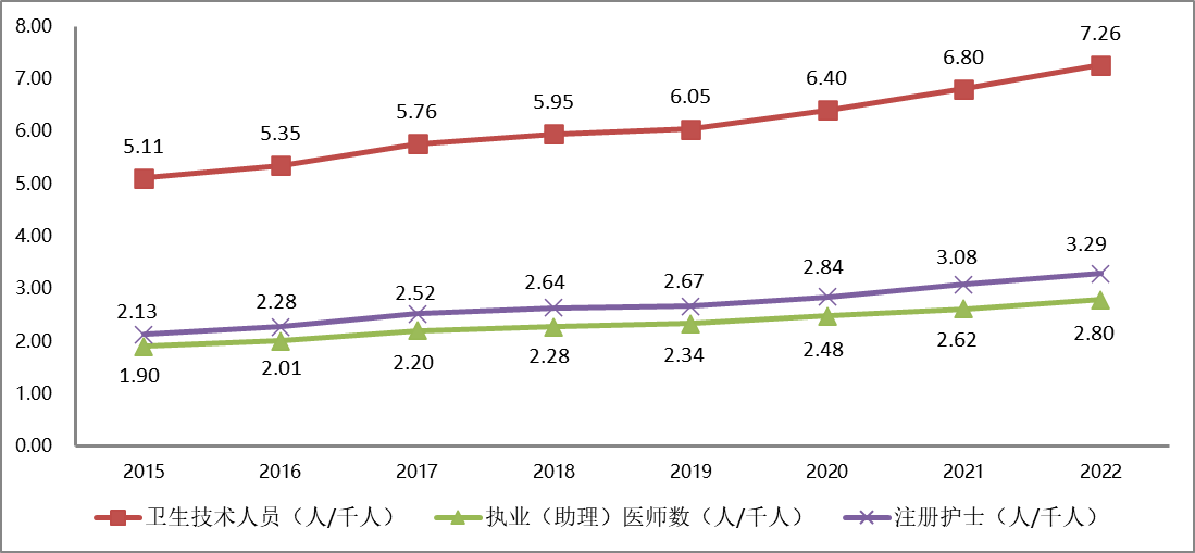 2015-2022年全市每千常住人口衛(wèi)生人員數(shù)