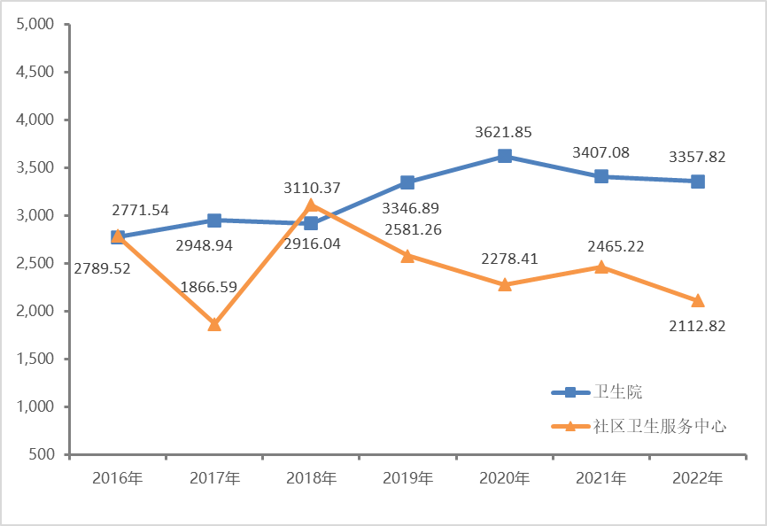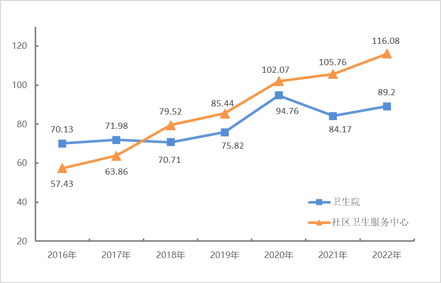 基層醫(yī)療機(jī)構(gòu)門診和住院費(fèi)用。2022年,社區(qū)衛(wèi)生服務(wù)中心次均門診費(fèi)用116.08元,較上年上漲9.76%;次均住院費(fèi)用2112.82元,較上年下降14.29%。衛(wèi)生院次均門診費(fèi)用、次均住院費(fèi)用分別為89.20元、3357.82元,分別較上年上漲5.98%、下降1.45%。