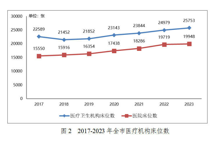 (二)醫(yī)療機(jī)構(gòu)床位數(shù)。截至2023年底,全市醫(yī)療機(jī)構(gòu)實(shí)際開(kāi)放住院床位25753張,其中:醫(yī)院19948張(內(nèi):民營(yíng)醫(yī)院5968張),婦幼保健機(jī)構(gòu)1406張,專科疾病防治機(jī)構(gòu)289張,衛(wèi)生院3383張,社區(qū)衛(wèi)生服務(wù)機(jī)構(gòu)698張,護(hù)理中心29張。與上年相比,床位總量增加774張,增長(zhǎng)3.10%。按照常住人口統(tǒng)計(jì),每千人口床位4.24張,較上年增加0.11張。