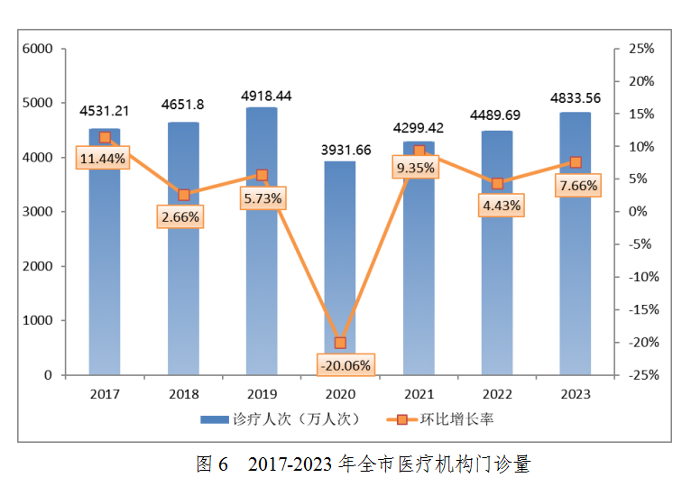 二、醫(yī)療服務(wù) 醫(yī)療機(jī)構(gòu)門診、住院量增加,基層診療人次占比提高。 (一)醫(yī)療服務(wù)量 診療量:2023年,全市醫(yī)療機(jī)構(gòu)總診療4833.56萬(wàn)人次,其中:醫(yī)院1764.57萬(wàn)人次,基層醫(yī)療機(jī)構(gòu)2751.43萬(wàn)人次(內(nèi):衛(wèi)生院、社區(qū)衛(wèi)生服務(wù)機(jī)構(gòu)1208.26萬(wàn)人次,村衛(wèi)生室490.66萬(wàn)人次,門診部(所)1052.51萬(wàn)人次),專業(yè)公共衛(wèi)生機(jī)構(gòu)317.56萬(wàn)人次。總診療人次較上年增加7.66%。