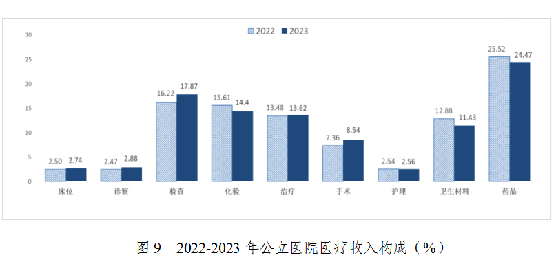 三、收支與費(fèi)用 醫(yī)療收入總量增加,收支結(jié)構(gòu)調(diào)整,住院費(fèi)用下降。 (一)收入支出 2023年,全市醫(yī)療衛(wèi)生機(jī)構(gòu)財(cái)政撥款收入、醫(yī)療收入占總收入的比重分別為21.31%、73.55%,其中財(cái)政撥款收入占比較上年提高2.25個(gè)百分點(diǎn),醫(yī)療收入占比較上年下降0.38個(gè)百分點(diǎn)。 公立醫(yī)院醫(yī)療收入中,藥品收入占比24.47%、耗材收入占比11.43%、檢查化驗(yàn)收入占比32.27%,醫(yī)療服務(wù)收入占比31.83%,其中藥占比、耗材占比分別下降1.05、1.45個(gè)百分點(diǎn),檢查化驗(yàn)占比、醫(yī)療服務(wù)占比分別提高0.44、2.06個(gè)百分點(diǎn)。