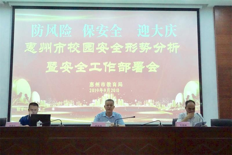 為進(jìn)一步總結(jié)我市校園安全工作經(jīng)驗(yàn),確保校園安全,深入分析當(dāng)前學(xué)校安全形勢(shì),部署下一階段特別是國(guó)慶期間學(xué)校的安全管理工作重點(diǎn)。9月20日,市教育局在光正實(shí)驗(yàn)學(xué)校召開(kāi)2019年安全形勢(shì)分析會(huì)暨安全工作部署會(huì)。市教育局楊炎林副局長(zhǎng)出席了會(huì)議,各縣(區(qū))教育局分管領(lǐng)導(dǎo)和安全辦主任、惠城區(qū)各學(xué)校負(fù)責(zé)人、市直學(xué)校分管副校長(zhǎng)和安全辦主任、惠州人保、惠州平安、教保中聯(lián)、學(xué)優(yōu)平臺(tái)、東江校車(chē)、心連心公益協(xié)會(huì)、平安之路等單位共計(jì)430余人參加了會(huì)議。