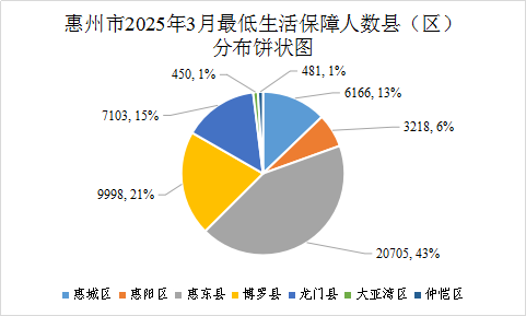 | 市縣區別 | 最低生活保障 | 特困供養 | | 戶數 | 人數 | 人數 | | 市合計 | 19046 | 48121 | 8841 | | 惠城區 | 2523 | 6166 | 1442 | | 惠陽區 | 1444 | 3218 | 770 | | 惠東縣 | 7883 | 20705 | 2563 | | 博羅縣 | 4142 | 9998 | 2428 | | 龍門縣 | 2667 | 7103 | 1470 | | 大亞灣區 | 193 | 450 | 44 | | 仲愷區 | 194 | 481 | 124 |