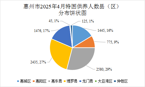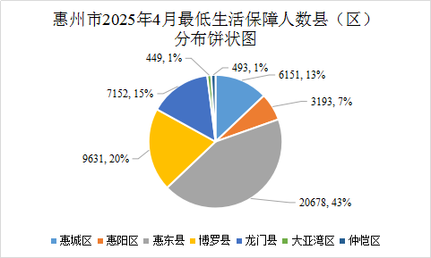 | 市縣區別 | 最低生活保障 | 特困供養 | | 戶數 | 人數 | 人數 | | 市合計 | 18890 | 47747 | 8881 | | 惠城區 | 2519 | 6151 | 1445 | | 惠陽區 | 1440 | 3193 | 775 | | 惠東縣 | 7859 | 20678 | 2580 | | 博羅縣 | 4006 | 9631 | 2435 | | 龍門縣 | 2680 | 7152 | 1476 | | 大亞灣區 | 192 | 449 | 45 | | 仲愷區 | 194 | 493 | 125 |