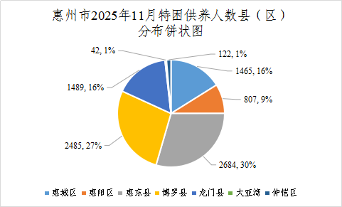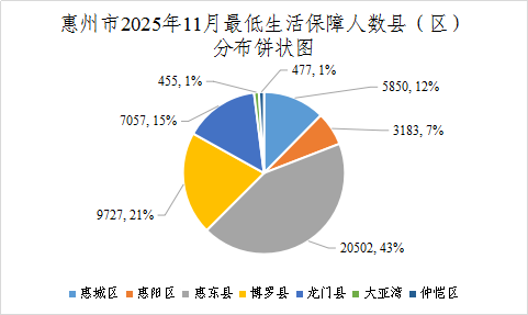 | 市縣區別 | 最低生活保障 | 特困供養 | | 戶數 | 人數 | 人數 | | 市合計 | 18703 | 47251 | 9094 | | 惠城區 | 2465 | 5850 | 1465 | | 惠陽區 | 1420 | 3183 | 807 | | 惠東縣 | 7773 | 20502 | 2684 | | 博羅縣 | 4013 | 9727 | 2485 | | 龍門縣 | 2643 | 7057 | 1489 | | 大亞灣 | 196 | 455 | 42 | | 仲愷區 | 193 | 477 | 122 |