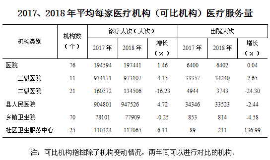 可比機構:按2017、2018年可比機構分析:2018年平均每家醫院診療人次197441人次,較上年增長1.46%,其中三級醫院973107人次,增長4.15%,二級醫院134506人次,減少16.23%,縣人民醫院947526人次,增長4.72%;平均每家鄉鎮衛生院77909人次,較上年減少0.25%;平均每家社區衛生服務中心117065人次,較上年增長6.11%(見表6)。
