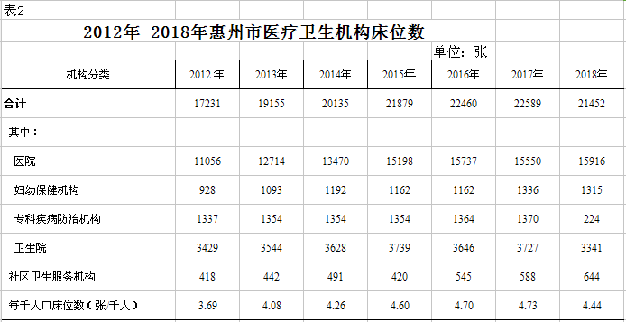截止2018年底,全市醫(yī)療衛(wèi)生機(jī)構(gòu)實(shí)有床位21452張,其中:醫(yī)院15916張(其中民營醫(yī)院4261張),婦幼保健機(jī)構(gòu)1315張,專科疾病防治機(jī)構(gòu)224張,衛(wèi)生院3341張,社區(qū)衛(wèi)生服務(wù)機(jī)構(gòu)644張。與上年相比,全市醫(yī)療衛(wèi)生機(jī)構(gòu)床位減少1137張,降低5.03%(見圖2、表2)。
