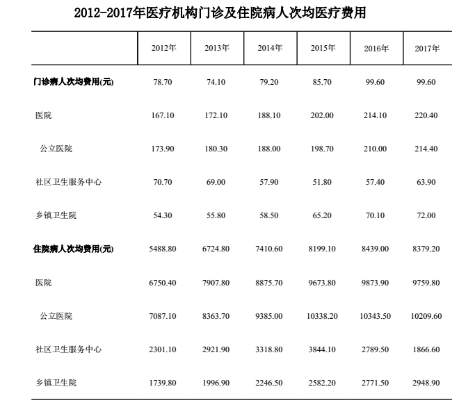 2012-2017年醫療機構門診及住院病人次均醫療費用