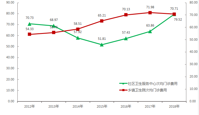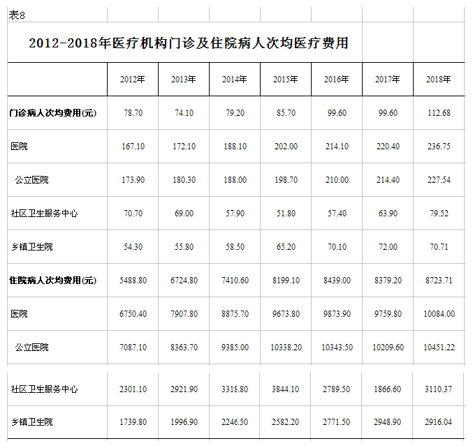 2.基層醫(yī)療機(jī)構(gòu)門診和住院費(fèi)用。2018年,社區(qū)衛(wèi)生服務(wù)中心次均門診費(fèi)用79.52元,較上年上漲24.44%;次均住院費(fèi)用3110.37元,較上年上升66.63%。鄉(xiāng)鎮(zhèn)衛(wèi)生院次均門診費(fèi)用、次均住院費(fèi)用分別為70.71元、2916.04元,較上年下降1.79%、1.11%(見圖 10 、表8)。