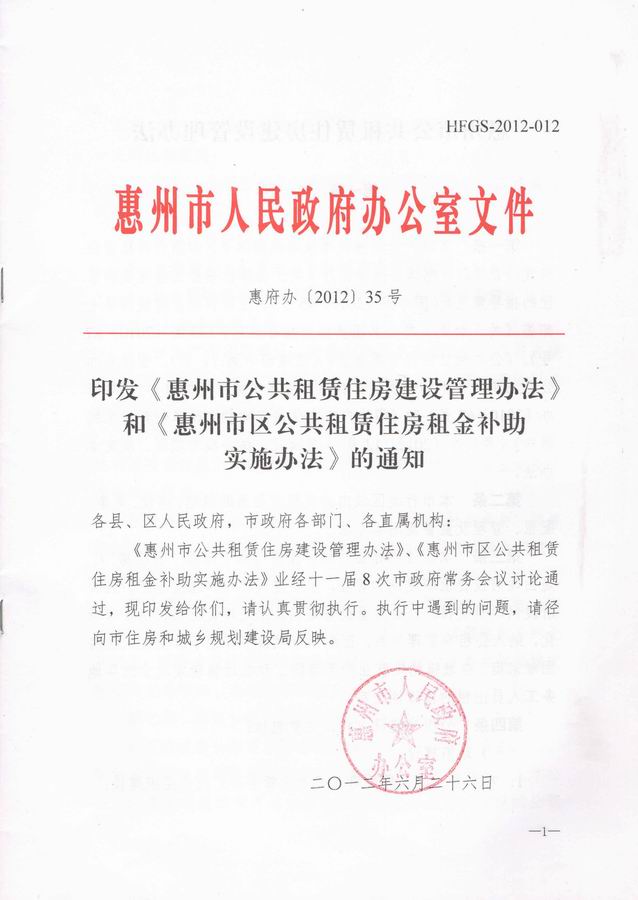 名  稱: 【已失效】印發《惠州市公共租賃住房建設管理辦法》和《惠州市區公共租賃住房租金補助實施辦法》的通知